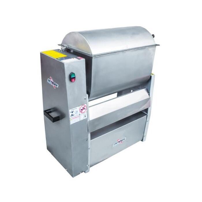 O misturador de carne industrial é fabricado em aço inox, tanto em sua estrutura, como o seu conjunto de pás misturadoras, tanque com basculagem manual e tampa. O tanque tem capacidade de 50kg, operando com potência de motor a 0,5 CV, alcançando uma produtividade de até 600 kg/h.