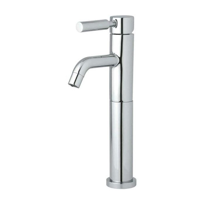 O Misturador Monocomando de Mesa para Lavatório Futura Bica Alta Cromado Perflex possui um design em forma de tubo cilíndrico que lembra torneiras antigas, mas com uma pegada moderna e elegante;