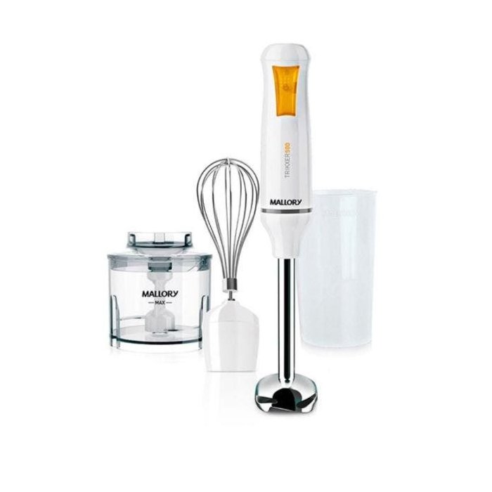 Descrição O TRIKXER 500 da Mallory é 3 em 1 e funciona com apenas um clique. Versátil, é mixer, processador e batedor de massas leves, trocando apenas o acessório. Prático e superpotente, possui lâminas em aço inoxidável que picam gelo, Mix Up System que melhora a circulação dos alimentos pelas lâminas e braço em aço inox que possibilita o preparo de alimentos quentes. Desmontável e de fácil limpeza. Acompanha um copo ultra resistente. Prepare sucos, vitaminas, shakes, smoothies, molhos e outras diversas receitas. CARACTERÍSTICAS • 500W de potência • 3 em 1 – Mixer, Processador e Batedor • Funciona com apenas um clique • Desmontável • Lâmina pica gelo • Lâminas e braço em aço inoxidável • Trava de segurança *VOLTAGEM 110v*