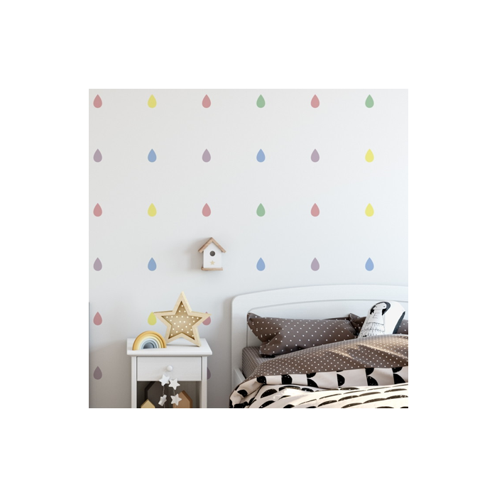 Esses adesivos vão dar um toque especial na parede de quartos de bebês e alegrar o ambiente com um colorido suave e doce.Medidas de cada gota 3x5cm (LxA). Para 1m2 é recomendado em média de 16 gotas.