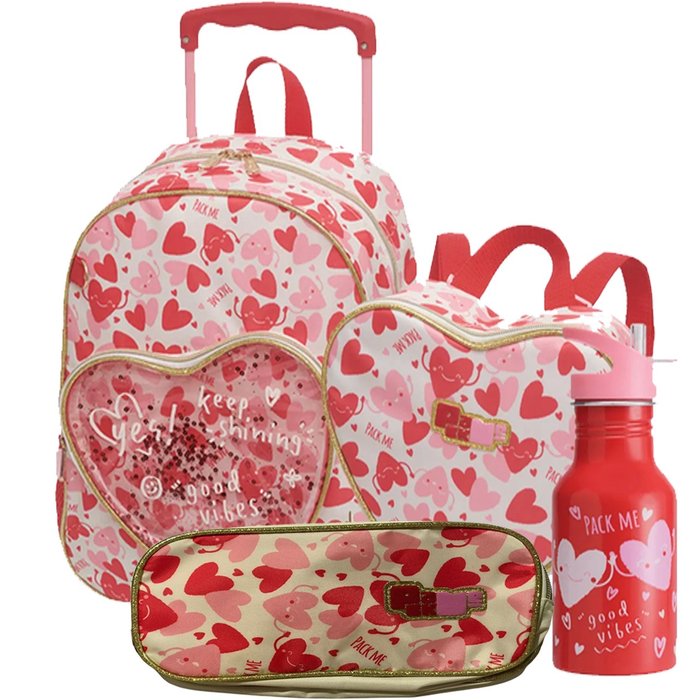Mochila Coração Pack Me + Lancheira + Squeeze + Estojo Lovely Pacific Vermelho