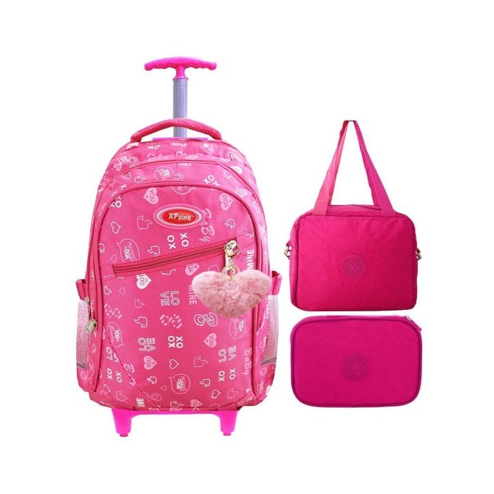 Mochila Escolar Feminina Rodinhas 2102 rosa + Kit Estojo 100 pens + Lancheira Térmica