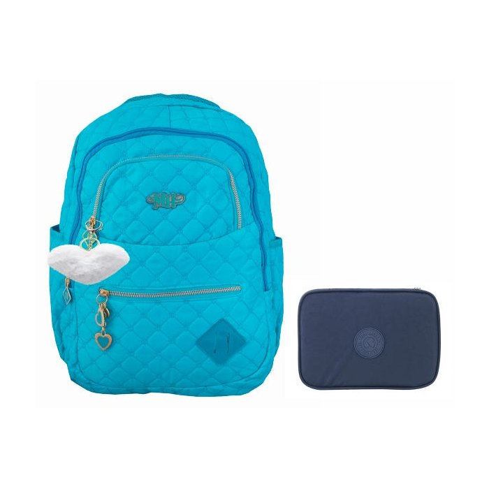 Mochila Escolar Notebook Feminina Azul água + Estojo 100 pens Grande