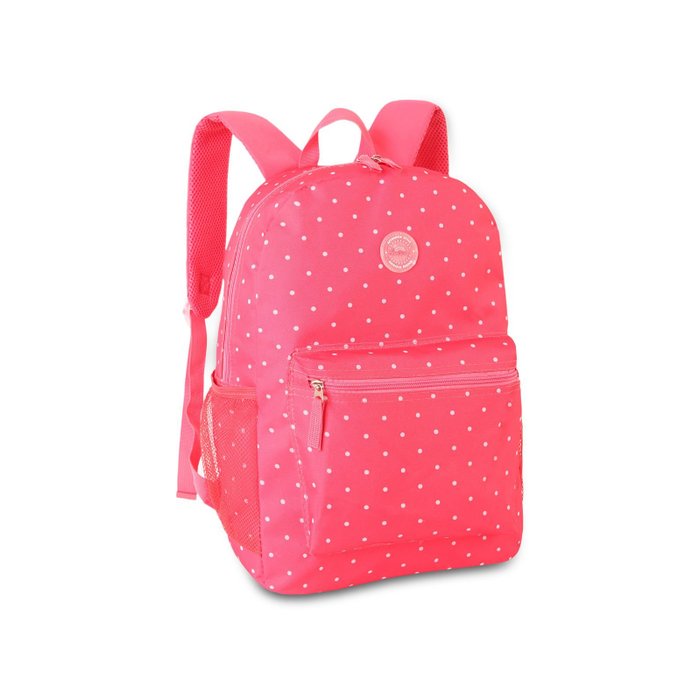 Mochila Feminina Estampada confeccionada em material lona. Possui estampa de poá, repartição única com fechamento por zíper, bolso frontal, alça de mão, alças ajustáveis, na parte de trás, acabamento e costura no tom.