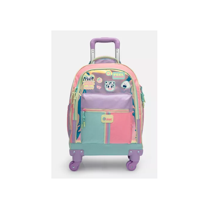 A mochila grande de rodinhas com nossas cores lindas em color block é ideal para a escola e viagens. Grande espaço interno. Compartimentos: 1 compartimento principal, 1 bolso frontal médio, 1 bolso frontal pequeno e 1 bolso lateral para garrafinha. Acompanha cartela de adesivos para customização. Possui bolso frontal em TPU holográfico com transparência, área perfeita para fixar os adesivos que acompanham a mochila. Possui alça de mão e puxador com duas alturas de regulagem. Possui bolsinho lateral para garrafinha. ? Tamanho: Único ? Medidas: 35 cm x 55 cm x 25 cm (LxAxP ? Indicado para: Crianças ? Ocasião: Escolar e Viagens ? Material externo: Poliéster (nylon) ? Material diferenciado: TPU holográfico ? Material Interno: Poliéster ? Alças: 2 alças de ombro reguláveis e 1 alça de mão fixa. ? Qtde de rodas: 4 rodas fixas que giram 360 graus ? Fechamento: Com zíper ? Carrinho: fixo com duas opções de altura para o puxador ? Capacidade: 40 litros