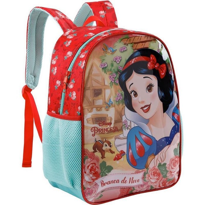 Em tamanho 14", produzida em poliester resistente e estampado. Painel frontal PVC Cristal - Compartimento principal amplo, 2 bolsos laterais mesh, ziper com puxadores simples, alca de mao em nylon e piping com glitter . Alcas acolchoadas com regulagem de tamanho para maior conforto.