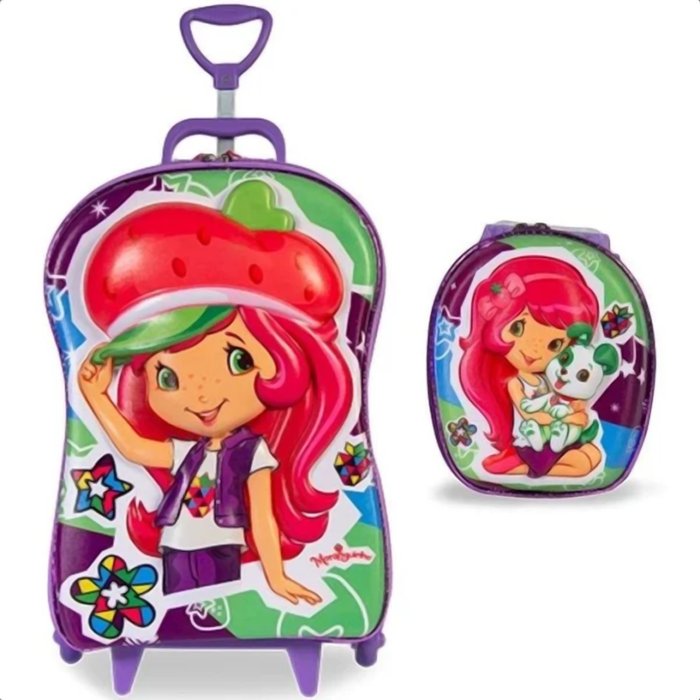 Mochila Infantil Moranguinho Alto Relevo 3D Com Lancheira e Rodinhas