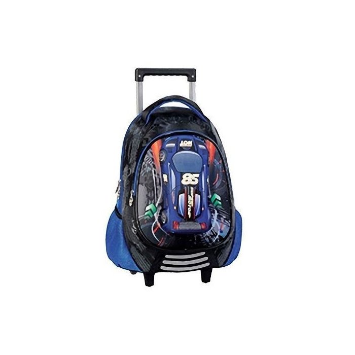 Mochila Infantil masculino com carrinho 3D Super MotorProduzida em poliéster e plásticoBolso FrontalBolso lateral em tecidoRodas em silicone