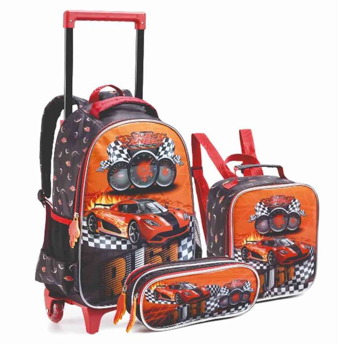Assim, ele é um kit mochila escolar infantil Carros rodinhas + lancheira + estojo = muita diversão!