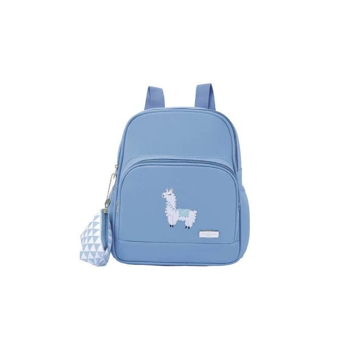 Mochila Lhama Azul queridinha pelas mamães a mochila maternidade lhe traz conforto e praticidade, lhe deixa com as mãos livres para cuidar do seu bebê! A Mochila Maternidade Listras, possui um bolso na frente para colocar os itens da mamãe e outras coisas que precisam estar sempre à mão, bolsos laterais que acomodam garrafinhas e outros objetos, internamente a Mochila Maternidade Listras, possui um elástico para prender mamadeira ou copinho, bolso interno e amplo espaço para organizar tudo que é necessário. Mochila Maternidade Listras é confeccionada em um lindo material com discreto brilho, possui aplique de coelho e acompanha pompom.