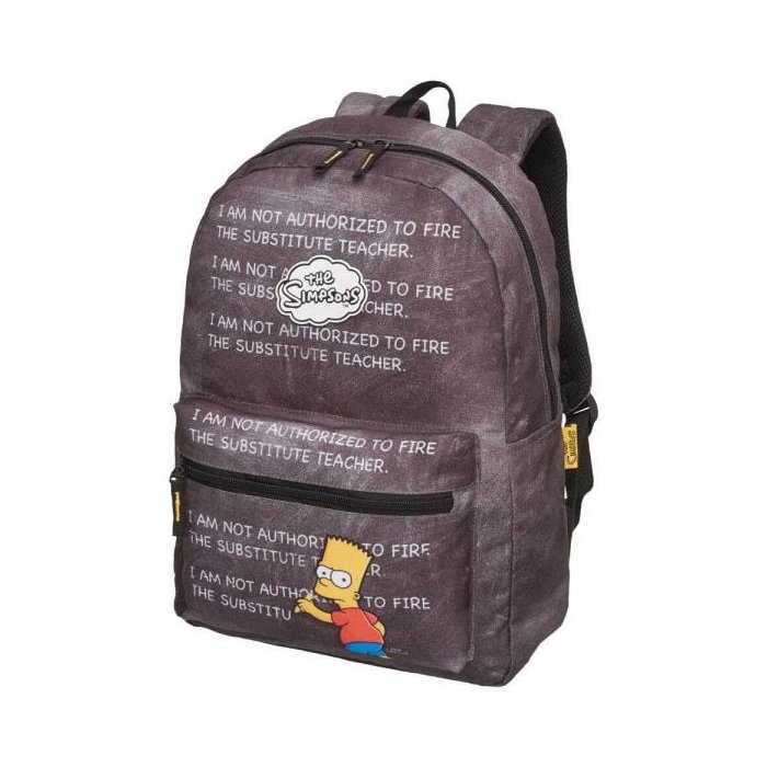 Mochila escolar Bart Simpson em material poliéster estampado, com bolso frontal grande e uma abertura principal em zíper, puxador de zíper em gorgurão. Possui alças com espuma e reguláveis. Com o personagem Bart Simpson escrevendo na lousa, como na abertura do desenho animado, a escolha vira uma mochila descontraída e original.