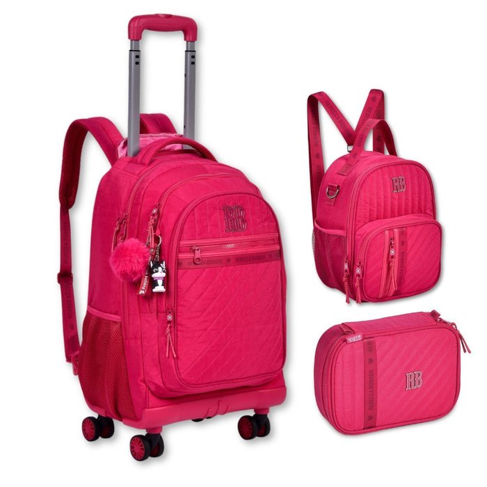 Com dimensões aproximadas de 48x33x19 cm, a mochila de rodinhas RB24518 é a escolha perfeita para quem busca praticidade, organização e muito estilo. O modelo conta com 4 rodinhas que permitem um giro completo de 360º, garantindo maior mobilidade e conforto ao transportar. Feita em crinkle com detalhes em matelassê, a mochila traz um toque sofisticado e moderno, acompanhando um chaveiro de pompom fofo e a mascote Rebecca Bonbon em 3D, dando ainda mais charme ao produto. A RB24518 é extremamente funcional: seu compartimento principal é espaçoso e conta com divisórias acolchoadas específicas para notebook e tablet, mantendo seus equipamentos eletrônicos seguros e organizados. Além disso, possui 3 compartimentos frontais com fechamento em zíper, perfeitos para guardar materiais menores e itens que precisam estar sempre à mão. Os bolsos laterais em tela são ideais para acomodar garrafinhas de água ou outros objetos essenciais. A mochila oferece a opção de ser usada no carrinho ou nas costas. Suas alças ajustáveis e acolchoadas garantem conforto ao carregar, enquanto o bolso especial para guardar o puxador metálico e a proteção para cobrir as rodinhas evitam que suas roupas fiquem sujas quando usada como mochila de costas. Tudo isso com a qualidade garantida da marca Rebecca Bonbon, uma escolha que une estilo e funcionalidade. A Lancheira RB24523 foi feita para garantir que seus lanches fiquem fresquinhos. Com revestimento térmico e três compartimentos com zíper, ela facilita a organização dos seus alimentos e pequenos objetos. Com alças versáteis, você pode carregá-la na mão, nas costas ou de forma transversal, oferecendo diversas opções para o seu conforto. Dimensões aproximadas: 27x20x12 cm. E para completar, o ESTOJO BOX RB24525, com elásticos que acomodam até 36 lápis e um estojo interno com zíper, perfeito para manter tudo no lugar. Dimensões aproximadas: 22x16x06. (Não acompanha lápis/canetas) Adquirindo o kit completo, você não só economiza, como garante produtos que se combinam em estilo e qualidade! Um presente perfeito para quem ama Rebecca Bonbon e não abre mão de se destacar em qualquer lugar.