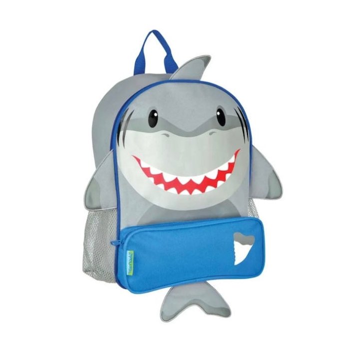 A mochila de tubarão da Stephen Joseph tem dois bolsos laterais e um bolso frontal externo, um compartimento interno amplo e alças ajustáveis.
