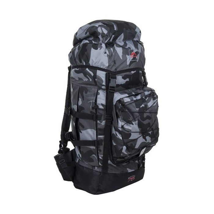 São três bolsos externos e fundo em lona de náilon reforçado. Armação em alumínio e regulagem das alças em cinco pontos. O acesso pode ser pela tampa ou pelo frente. Toda feita em náilon grosso, sendo ideal para uso super pesado e intenso. 1.Alça superior para transporte 2.Dois bolsos laterais expansíveis 3.Bolso frontal 4.Tampa telescópica com bolso externo e com regulagens na frente 5.Quatro argolas na tampa, para carregar materiais 6.Fechamento por cordeletes e dois fechos frontais 7.Quatro alças laterais reguláveis (duas de cada lado) para prender objetos como isolantes, barracas etc. 8.Acesso pela frente da mochila 9.Espaço interno total de 75 litros 10.Alças reguláveis e acolchoadas 11.Ajuste de altura das alças 12.Ajuste de estabilidade nas alças 13.Duas argolas nas alças, para prender objetos com mosquetões (vendidos separadamente) 14.Costas acolchoadas na parte em contato com a cintura 15.Armações de metal internas 16.Barrigueira estabilizadora regulável de 8 cm. acolchoada e fita de 5cm., para maior estabilidade com a mochila cheia 17.Peitoral Regulável 18.Feita em lona de náilon e náilon resinado. Capacidade: 75 litros/15 kg de carga Comprimento: 80 cm Largura: 32 cm Altura: 20 cm (profundidade) Peso: 2,5 kg