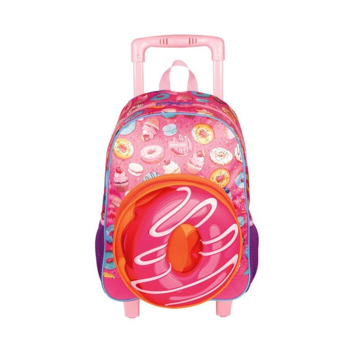 A Mochila de Rodinhas Grande Sestini 20X Candy apresenta a coleção que você não vai querer passar vontade. Produzida em sua grande parte de Poliéster, um material muito resistente. Possui carrinho em alumínio facilitando o transporte por adultos e crianças e alça de mão. Tem bolso frontal com painel em 3D destacando ainda mais o personagem e bolsos laterais em redinha com elástico para colocar pequenos objetos. Além disso, tem fechamento por zíper e identificador no verso para colocar o seu nome.