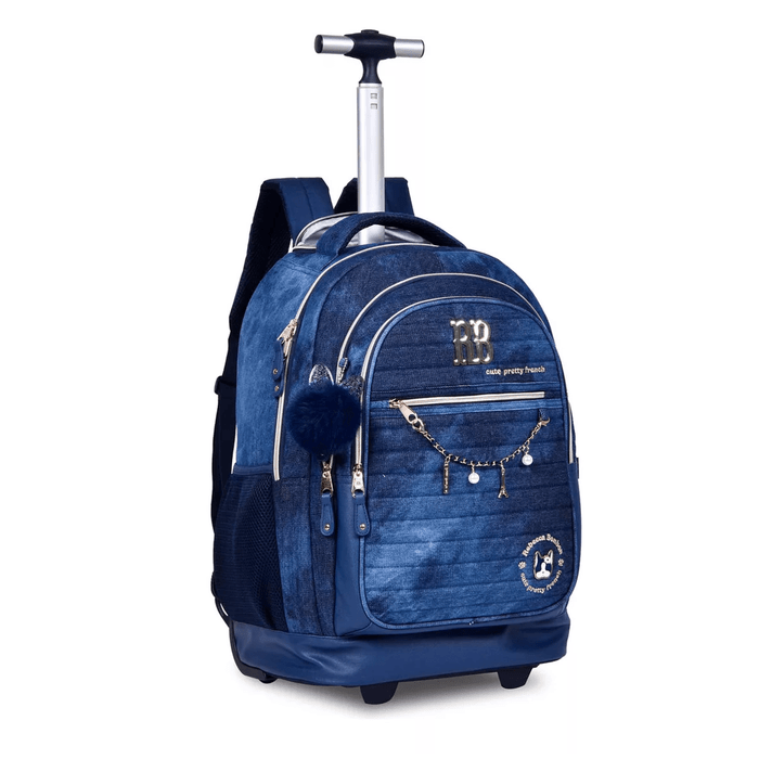 Explore o mundo fashion com a nova coleção de mochiletes Rebecca Bonbon da Clio, um verdadeiro evento para as fashionistas. Com charme, beleza e qualidade incomparáveis, essa linha é a escolha perfeita para quem busca se destacar com estilo. A Bulldog mais encantadora de Paris retorna ao Brasil com novas cores e detalhes, proporcionando ainda mais charme. Não perca tempo e adquira a sua! A mochila de rodinha, confeccionada em jeans com detalhes em PVC, apresenta uma placa de metal com o rosto da RB, fechamento em zíperes dourados e um adorável chaveiro de pompom. Prática e elegante para você em todos os momentos.