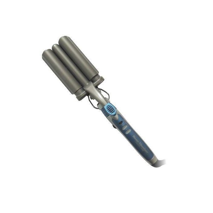 Nano Titanium Modelador de três Barril tem muitas vantagens. O Titânio é um excepcional condutor de calor e é estável em temperaturas extremamente altas. O Barril Em Nano Titanium combina com A tecnologia Nano Titanium liga micro-partículas de titânio fornecer o melhor desempenho térmico para um cabelo bonito e saudável. O Nano Titanium também produz o máximo de calor infravermelho longo, aquecendo o cabelo de dentro para fora, modelando sem danificar o cabelo, e emite íons negativos para modelagem mais rápida que mantém a umidade natural dos cabelos. Este Modelador dará a seu cabelo um brilho suave e sedoso, eliminando o frizz.