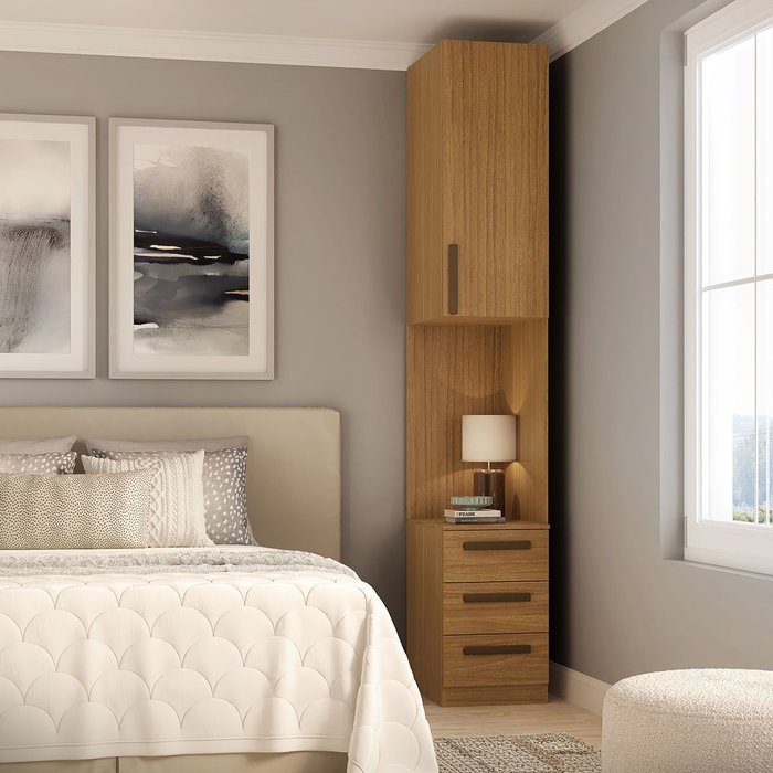 O módulo mesa de cabeceira serve para você montá-lo ao lado da cama, para usar de apoio quando está confortável em sua cama! Ele possui 3 gavetas para organização de objetos e aéreo para mais armazenamento em seu quarto.