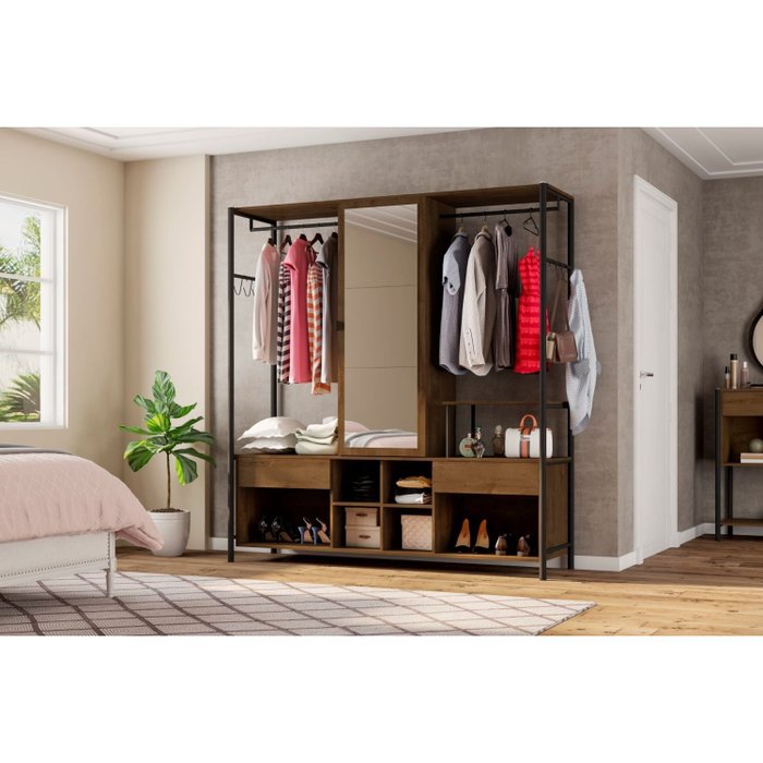 Pronto para revolucionar o visual do seu quarto? Contando com a ajuda do Guarda-Roupa Barcelona isso será fácil. Por ter a característica de closet, ele deixa todas as peças à mostra e oferece espaço para as suas vestimentas e acessórios que precisam ficar pendurados, para calçados, roupas de cama e até itens decorativos, além das gavetas que guardam com segurança objetos menores. Ah, outro aspecto muito legal do móvel é a combinação de marrom e preto e todo o toque industrial que recebe com a estrutura de aço carbono aparente. Com ele, a organização, beleza e bom gosto são garantidos em seu lar.!