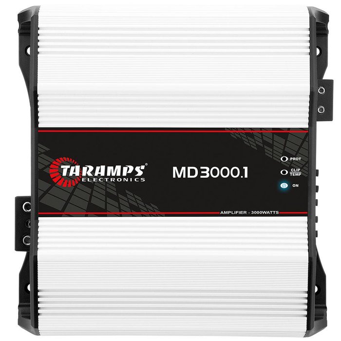 Modulo Taramps Md 3000.1 3000W RMSImpedância: 1 ohmNúmero de Canais: 01Potência Nominal @12.6 Vdc - 1 ohm: 3000W RMSPotência Nominal @12.6 Vdc - 2 ohms: 1920W RMSSensibilidade de Entrada: 220mVRelação Sinal/Ruído: >90dBResposta de Frequência (Full Range): 10Hz ~ 18KHz (-3dB)**Crossover:H.P.F (Filtro Passa Alta): 10Hz ~ 90Hz (-12dB/8ª) VariávelL.P.F (Filtro Passa Baixa): 90Hz ~ 18KHz (-12dB/8ª) VariávelBass Boost: 35Hz ~ 55Hz / 0 ~ 10.5dB (50Hz)Eficiência: 79%Impedância de Entrada: 22K ohmsSistema de Proteção: Curto na saída, curto na saída em relação ao Gnd, proteção de baixa impedância, proteção de tensão baixa/alta e proteção térmica.Tensão de Alimentação Mínima: 9 VDCTensão de Alimentação Máxima: 16 VDCConsumo em Repouso: 1.0AConsumo Musical: 150A