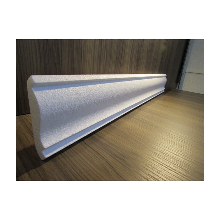 O kit contém 10m lineares de moldura roda teto, sanca, meia cana, de isopor EPS F4, sem revestimento. Dimensões: 10cm x 03 x 50cm (Face x Espessura/largura x Comprimento).