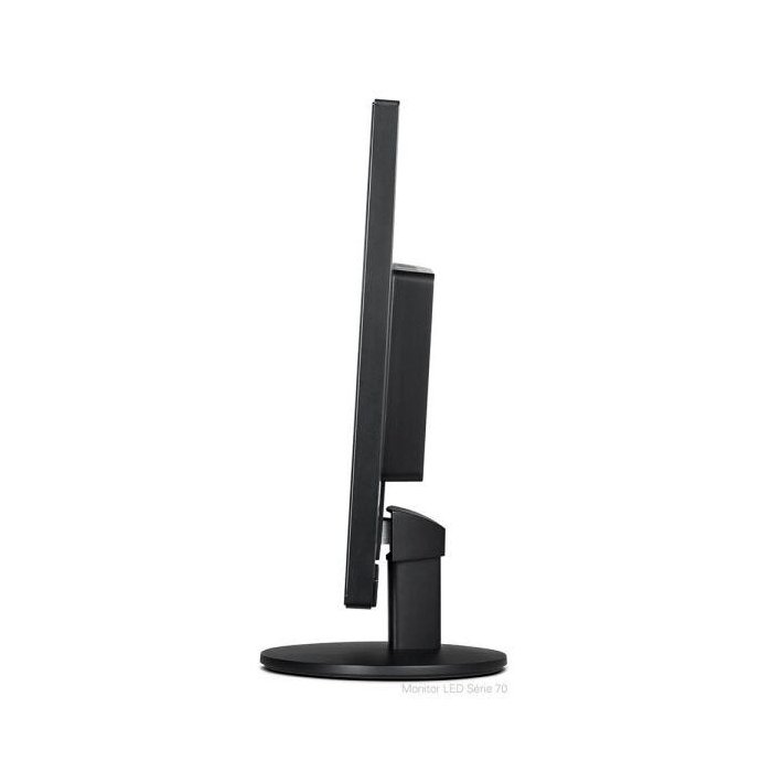 MONITOR 15,6" LED AOC E1670SWU/WM Prepare-se para experimentar novos níveis de som e cores optando pelo monitor AOC E1670 SWU / WM. Ele tem disposição para a conectividade multimídia com VGA, tornando-o ainda mais útil. - Tamanho do painel: 15,6" Widescreen - Iluminação do painel: LED - Tamanho da imagem visível (diagonal): 39,5 cm - Pixel pitch: 0,252 mm - Brilho: 180 cd/m2 - Relação de contraste dinâmico: 20.000.000:1 - Relação de contraste estático: 800:1 - Tipo de painel: Reflexivo - Tempo de resposta: 8 ms - Ângulo de visão horizontal: 90o - Ângulo de visão vertical: 50o - Frequência nativa do painel: 60Hz - Frequência de varredura horizontal: 30 ~ 50 kHz - Frequência de varredura vertical: 60 Hz ~ 75 Hz - Largura de banda: 85 MHz - Compatibilidade: Windows, MAC, Linux - Resolução máxima: 1366 x 768 @ 60 Hz (HD) - Resolução recomendada: 1366 x 768 @ 60 Hz (HD) - Suporte de cores: 26.2000 cores - Conectores: 1x VGA - Destaques: - - Sugestão de descrição: Monitor AOC 15.6" LED - Consumo: Ligado < 7 Watts (típico), Stand By < 0,5 Watt - Alto-Falantes: Não - Fonte : Interna - USB 5V DC - Plug & Play: DDC2B/CI - Controles manuais: Power - Função OSD (On Screen Display): Sim - Português e outros idiomas - Dimensões Monitor com base (L x A x P) - mm: 371 x 298 x 142 - Dimensões Monitor sem base (L x A x P) - mm: 371 x 233 x 33 - Dimensões Embalagem (L x A x P) - mm: 423 x 106 x 304 - Peso líquido: 0,87 kg - Peso bruto: 1,50 kg - VESA (sistema internacional de furação para fixação em paredes ou painéis): Sim (75 x 75) - Base ajustável : Não - Cor predominante do produto : Preta - Cor predominante da base: Preta - Normas/segurança/certificações - - Itens inclusos na embalagem : *Cabo de força USB, *cabo VGA, *certificado de garantia, *base e monitor - Código EAN: 789862027053 7 - Classificação fiscal: 85285220 - PPB: Sim - Portaria MCT/MDIC/MF: 236