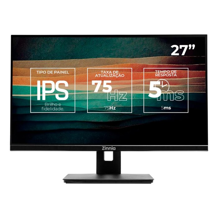 ZINNIA ZEUGO 27 O Digital está se tornando cada vez mais presente em nossas vidas. Seja para trabalhar ou estudar, a necessidade de o realizarmos utilizando uma tela está cada vez mais comum. Com a proposta de proporcionar uma melhor visualização, a Zinnia desenvolveu o monitor Zeugo. Com as configurações típicas para profissionais que necessitam de uma vasta gama de cores e precisão de imagens, o Zeugo completa seu trabalho, elevando-o. Indicado também para ser utilizado para entretenimento, como filmes e até mesmo jogos sejam visualizados de forma completa e limpa. Assim, ele se torna indispensável para sua casa ou seu escritório, possibilitando muitas configurações indo do office ao gamer. DESIGN Visando tornar o ambiente mais tranquilo, o monitor Zeugo conta com as linhas limpas, bordas finas, que facilitam a utilização de mais telas lado a lado. Com detalhes minimalistas, ele se mescla nos mais variados ambientes e trará harmonia visual que você almeja. TECNOLOGIA Beleza e sofisticação acompanham um baixo consumo de energia, devido à tecnologia LED, onde um padrão de LEDs ilumina toda a sua tela. Diminuindo também o aquecimento do monitor, você com certeza sentirá a diferença. ALTA FIDELIDADE DE CORES Seu contraste pode ser configurado no próprio monitor, assim como brilho, modo de imagem e várias outras opções de visualização, tornando-o altamente customizável para atender às suas necessidades de forma fácil, rápida e intuitiva. Características Tipo de painel Possui painel IPS, trazendo melhor fidelidade de cores e brilho da tela. Taxa de atualização Conta com uma taxa de atualização de 75Hz, deixando sua navegação mais fluída. Tempo de resposta Possui 5ms de tempo de resposta, para uma experiência de trabalho ágil e sem atrasos. Ângulo de visão Conta com ângulo de visão horizontal/vertical de 89/89/89/89 (típico) (CR>10). VESA Tamanho do padrão VESA (WxH) 100 x 100 mm. Conexões Contando com 1 x HDMI, 1 x DC e 1 x VGA, garante que não se preocupe com a falta de conexões em seu monitor.