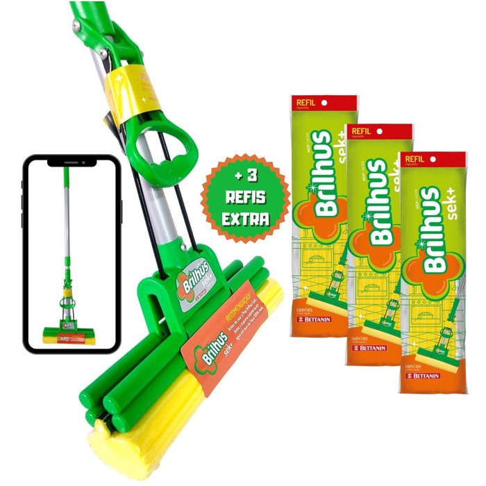Lava e seca pisos sem riscar as superfícies. Recolhe cabelos e pelos de animais. O brilhus mop sek+ possui uma alavanca, ao puxá-la, espreme a esponja molhada, deixando-a pronta para o uso.