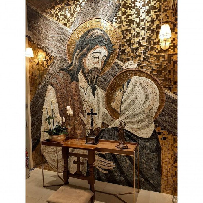 Mosaico Encontro De Jesus E Maria - Quarta Estação Da Via Sacra Tamanho 200x300cm O mosaico criado para PróVida em Cachoeira do Sul é uma obra em estilo contemporâneo que faz referência aos estilos do mosaico romano e bizantino. Ele retrata a quarta estação da Via Sacra, na qual Jesus encontra Sua mãe. Embora os Evangelhos não mencionem diretamente esse encontro, eles descrevem a presença de Maria junto à cruz, onde Jesus se dirige a ela e ao discípulo João. Suas palavras têm significados duplos: confiar Maria a João para que cuide dela e, de forma mais ampla, abrir a porta para nossa salvação. Esse mosaico ilustra a importância da confiança, que Jesus reforça ao longo de Sua jornada, desde o Monte das Oliveiras até a cruz. A confiança na fé e no Pai é fundamental, mesmo quando enfrentamos desafios aparentemente insuperáveis. No entanto, com o tempo, essa confiança leva à salvação, tornando-se um lembrete poderoso de como a fé pode nos guiar através das provações da vida. Aplicações: Nossos produtos são entregues montados de fácil aplicação - ideal para ambientes internos e externosEspecificações técnicas do mosaico:Funfo feito de pastilhas de ouro de alta resistência e mármores e granitos;Vem todo montado sobre tela, só colocar conforme manual de colocação,Resistência e Durabilidade em área interna e externa;Espessura de 6 mm – Mesma espessura do porcelanato ou piso cerâmico,Mosaico feito integralmente à mão com técnica do mosaico romano; Dúvidas frequentes:Não tenho colocador profissional, o que faço? Caso não tenha um colocador disponível, entre em contato para verificar a disponibilidade do nosso diretor, Leonardo, para auxiliar na colocação.Por que ocorre variação nos tons das pedras entre diferentes lotes?Essas variações são causadas por minerais diversos, inclusões e condições ambientais que se desenvolveram ao longo de milhões de anos de processo geológico. Essas características naturais não apenas embelezam as pedras, mas tornam cada projeto verdadeiramente especial e exclusivo.Posso fazer em outro tamanho? Para tamanhos que não estejam disponíveis no site, você pode entrar em contato conosco, pois realizamos encomendas sob medida.Como é transportado? - O mosaico é protegido em plástico bolha e embalado em uma caixa de papelão. Em caso de tamanhos maiores, também é colocado em uma caixa de madeira.Vale ressaltar que ele é flexível, o que permite dobrá-lo, facilitando para a transportadora.. A transportadora coleta aqui em nosso ateliê e entrega no seu endereço..No entanto, se você tiver urgência, por favor, entre em contato conosco para verificar a possibilidade de produzirmos em um menor..É possível mudar as cores e materiais? Recebemos frequentemente essa pergunta, no entanto, não recomendamos fazer alterações nas cores e materiais padrão. Fazer mudanças pode resultar em um resultado que pode não atender às suas expectativas.