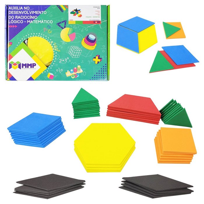 O Mosaico Geométrico Aluno modelo A083 da MMP, acompanha 53 peças coloridas divididas em hexágonos, trapézios isósceles, losangos em dois tamanhos, triângulos equiláteros e quadrados, tendo sempre em cada figura um lado de medida comum. Este material pedagógico no formato de brinquedo educativo desenvolve habilidades de composição e decomposição de figuras, ladrilhamento, recobrimento, simetria, ângulos, frações, adição e subtração de forma lúdica e divertida. A maioria das instituições de ensino optam por materiais didáticos porque eles são fáceis de higienizar, seguros e duráveis, de forma que o custo-benefício é bastante atrativo. É possível ter uma coleção de materiais pedagógicos diferentes, que estimulam diversos aspectos do corpo e da mente, fazendo com que os meninos e meninas queiram ficar nesses espaços por horas e horas, de forma lúdica e agradável. Quando se trata de atividades para a educação infantil, as quais tenham potencial para divertir e ensinar, os materiais didáticos matemáticos, são sempre um bom investimento educativo! Este material escolar infantil é feito em EVA, e é indicado para crianças a partir de 4 anos de idade, não emite som nem luz, razão pela qual dispensa o uso de pilhas e baterias, e as imagens são meramente ilustrativas. Conteúdo da Embalagem: 1 Mosaico com 53 Peças Geométricas Coloridas e 1 Manual de Instruções. Certificação de Segurança: Isento de certificação do INMETRO de acordo com o item 1 e 76 do anexo B da portaria 563/2016 Todos os nossos produtos são originais com garantia e acompanham nota fiscal.