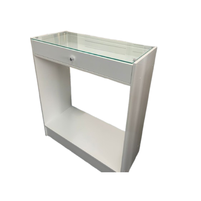 Mostruário Expositor de Loja com Gaveta e Prateleira – Mdf Branco com Vidro 100x85x38cm