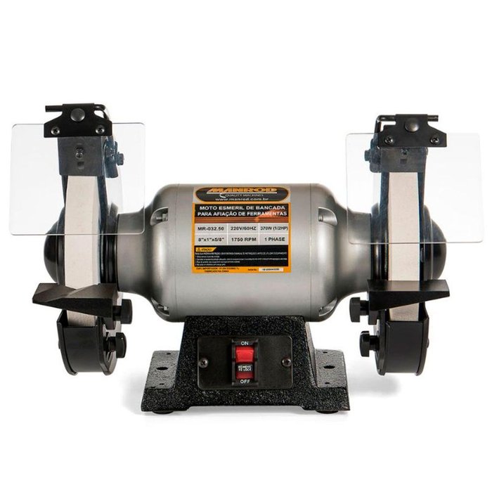 Moto Esmeril com baixa rotação para afiação de ferramentas, rebolo branco de Ø 8' / 200mm, 1450rpm, 370W,(220V-MONOFÁSICO) O QUE É O MOTO ESMERIL COM BAIXA ROTAÇÃOO moto esmeril com baixa rotação é uma ferramenta elétrica utilizada para afiar, polir e desbastar materiais diversos. A característica distintiva desse tipo de moto esmeril é a sua capacidade de operar em rotações mais baixas em comparação com os moto esmeris convencionais. Isso é particularmente benéfico para tarefas que exigem um controle mais preciso e para evitar o superaquecimento do material sendo trabalhado. O moto esmeril com baixa rotação é comumente usado em trabalhos de afiação de ferramentas, rebarbação e polimento, onde a delicadeza e o controle são essenciais para obter resultados precisos. COMO UTILIZAR O MOTO ESMERIL COM BAIXA ROTAÇÃOPara utilizar o motoesmeril de bancada, comece garantindo sua fixação sólida em uma bancada estável e verifique a condição dos rebolos. Escolha o rebolo apropriado, ajuste ferramentas e acessórios, como suportes para ferramentas, e configure a altura e inclinação do apoio. Conecte o motoesmeril à fonte de energia, ajuste a velocidade se necessário e, ao ligar, aguarde atingir a velocidade máxima. Ao esmerilhar, segure a peça firmemente e mova-a suavemente contra o rebolo, monitorando o processo e fazendo ajustes conforme necessário. Desligue o motoesmeril ao concluir, realize limpeza e manutenção regular, e adote medidas de segurança, como o uso de equipamentos de proteção individual. Consulte sempre o manual do usuário para orientações específicas. DESCRIÇÃO DO MOTO ESMERIL DE BANCADA- Motor: 1/2HP;