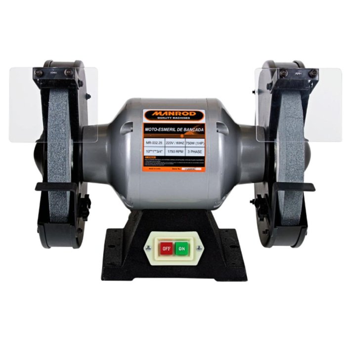 Moto Esmeril de Bancada Industrial, 750W / 1 HP, 2.950 RPM, (220V-TRIF) O QUE É O MOTO ESMERIL DE BANCADAO motoesmeril de bancada é uma ferramenta estacionária projetada para realizar operações de esmerilhamento, desbaste e afiação em peças metálicas. Ele consiste em um motor elétrico que aciona dois rebolos, geralmente de diferentes granulometrias, montados em eixos opostos. Esses rebolos giram a alta velocidade, proporcionando a remoção de material de forma eficiente. O motoesmeril de bancada é comumente utilizado em oficinas e ambientes de trabalho para afiar ferramentas, desbastar peças metálicas e realizar operações de acabamento. Sua configuração estacionária permite uma fixação segura em bancadas, proporcionando estabilidade durante o processo de esmerilhamento. Essa ferramenta é valiosa em atividades que exigem precisão e controle no desgaste ou afiação de materiais metálicos. COMO UTILIZAR O MOTO ESMERIL DE BANCADAPara utilizar o motoesmeril de bancada, comece garantindo sua fixação sólida em uma bancada estável e verifique a condição dos rebolos. Escolha o rebolo apropriado, ajuste ferramentas e acessórios, como suportes para ferramentas, e configure a altura e inclinação do apoio. Conecte o motoesmeril à fonte de energia, ajuste a velocidade se necessário e, ao ligar, aguarde atingir a velocidade máxima. Ao esmerilhar, segure a peça firmemente e mova-a suavemente contra o rebolo, monitorando o processo e fazendo ajustes conforme necessário. Desligue o motoesmeril ao concluir, realize limpeza e manutenção regular, e adote medidas de segurança, como o uso de equipamentos de proteção individual. Consulte sempre o manual do usuário para orientações específicas. DESCRIÇÃO DO MOTO ESMERIL DE BANCADA- Potência do motor: 750W (1 HP);