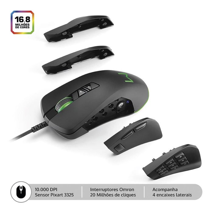 Velocidade e desempenho, equipado com sensor Pixart 3325, alcançando até 10.000 DPI, e Switch Omron com durabilidade de até 20 milhões de cliques.
