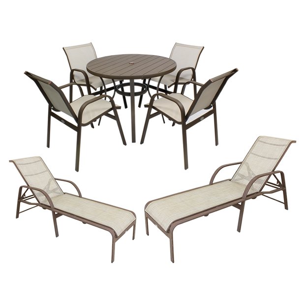Espreguiçadeira e cadeira suporta até 150kg.