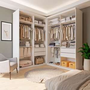 O closet modulado é vendido em peças separadas, os módulos. Os módulos podem ser dispostos de formas diferentes no ambiente. Assim, você personaliza o seu closet do jeito que preferir e melhor se encaixar no espaço disponível.