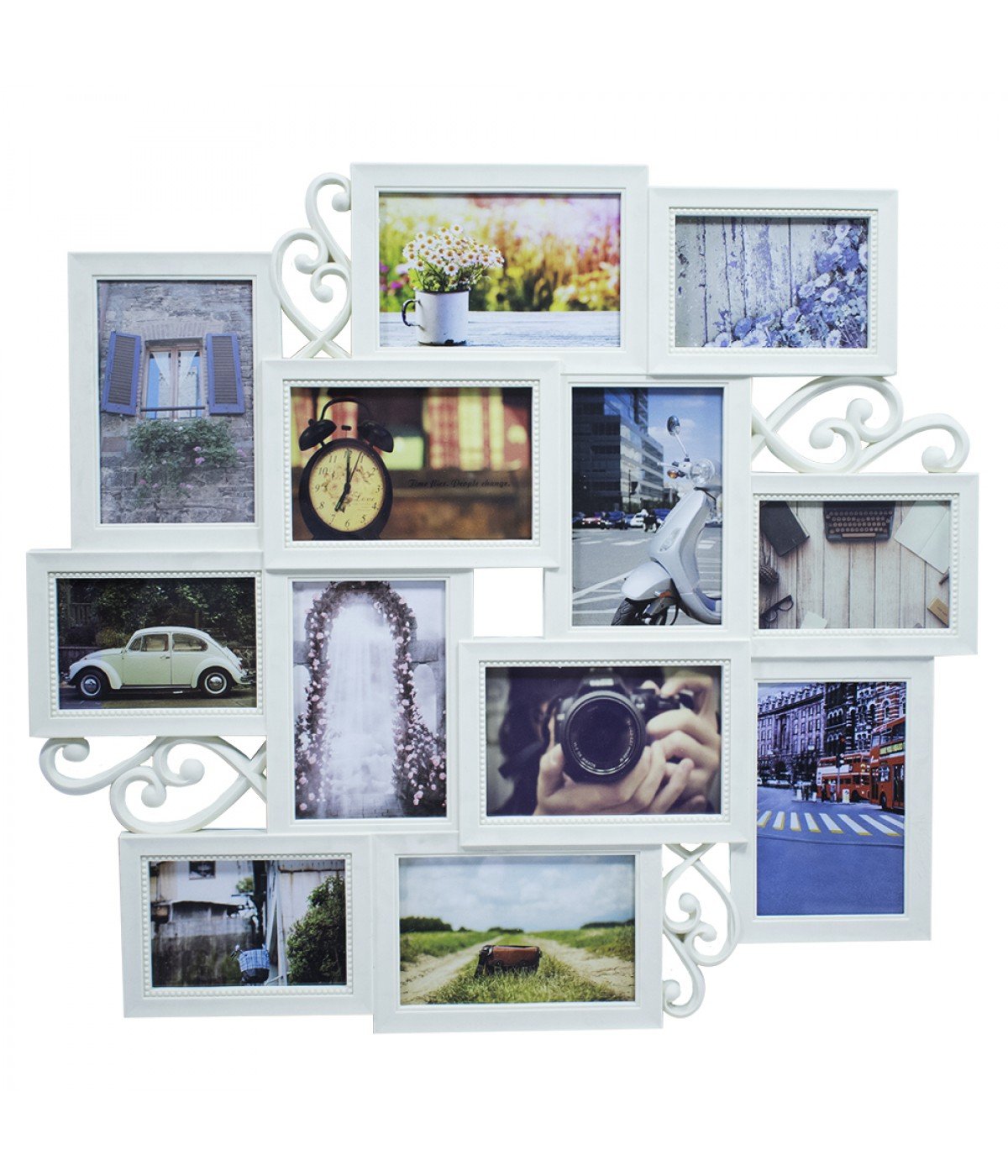 Porta Retrato 8 Fotos 10X15cm 4 Fotos 9X13cm Multi porta retrato moldura branco para 8 fotos 10 x 15 cm e 4 fotos 9 x 13 cm. Pode ser usado tanto pendurado na parede como encostado. Material: plástico