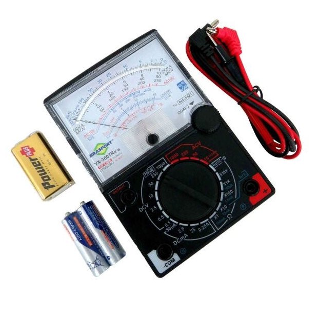Multímetro Analógico com sinal sonoro de continuidade, Utilizado na bancada de trabalho (laboratório) ou em serviços de campo, incorpora diversos instrumentos de medidas elétricas em um único aparelho.