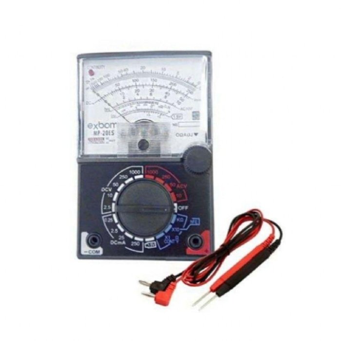 - Multímetro Analógico profissional- O multímetro analógico é uma excelente opção para quem precisa realizar suas medições de maneira rápida e eficiente!- Possui sensibilidade de 20ko/V e mostrador analógico. ;ESPECIFICAÇÕES TÉCNICAS:- Marca: Exbom- Display: Analógico- Ilumi/Barra Graf.: Não- Corrente AC: Não- Temperatura: Não- Capacitância: Não- Frequência: Não- Duty Cycle: Não- Auto Desligamento: Não- Teste Continuidade: Diodo, hFE e Alarme Sonoro- Mudança de faixa: manual (5 funções)- Categoria: CAT II 1000V- Tensão DC: 0,25V/0,5V/2,5V/10V/50V/250V/1000V- Tensão AC: 10V/50V/250V/1000V- Corrente DC: 50uA/2,5mA/25mA/250mA- Resistência: 1K/10K/100K/1M/10M(ohms)- Precisão básica: de 0,5% à 2,5%- Dimensões aproximadas do produto AxLxP: 10 x 12,2 x 3,5 cm ;CONTEÚDO DA EMBALAGEM:- 1 un. Multímetro Analógico profissional- 2 un. fios pontas de prova- 1 un. manual de uso ; ;Tag : Multemetro , mutimetro , motimetro , moutimetro , muotimetro.