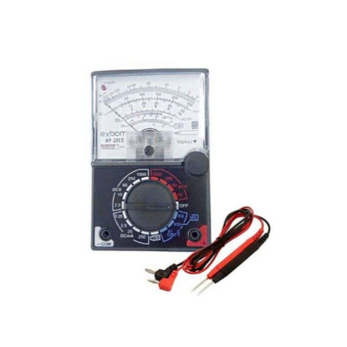 - Multímetro Analógico profissional- O multímetro analógico é uma excelente opção para quem precisa realizar suas medições de maneira rápida e eficiente!- Possui sensibilidade de 20ko/V e mostrador analógico.ESPECIFICAÇÕES TÉCNICAS:- Marca: Exbom- Display: Analógico- Ilumi/Barra Graf.: Não- Corrente AC: Não- Temperatura: Não- Capacitância: Não- Frequência: Não- Duty Cycle: Não- Auto Desligamento: Não- Teste Continuidade: Diodo, hFE e Alarme Sonoro- Mudança de faixa: manual (5 funções)- Categoria: CAT II 1000V- Tensão DC: 0,25V/0,5V/2,5V/10V/50V/250V/1000V- Tensão AC: 10V/50V/250V/1000V- Corrente DC: 50uA/2,5mA/25mA/250mA- Resistência: 1K/10K/100K/1M/10M(ohms)- Precisão básica: de 0,5% à 2,5%- Dimensões aproximadas do produto AxLxP: 10 x 12,2 x 3,5 cmCONTEÚDO DA EMBALAGEM:- 1 un. Multímetro Analógico profissional- 2 un. fios pontas de prova- 1 un. manual de uso