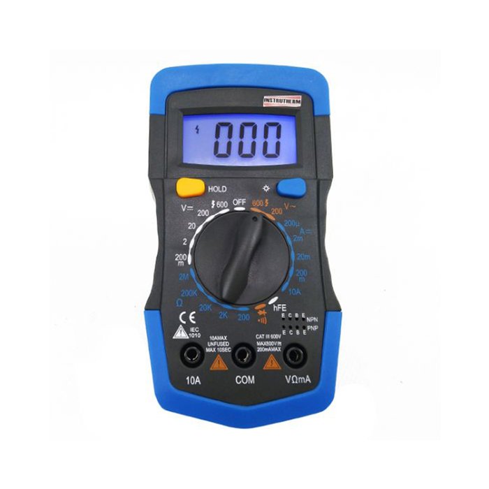 Multímetro digital com display LCD de 3 1/2 (1999 contagens) retroiluminado, realiza medição de tensão, corrente contínua, resistência, teste de diodo e continuidade com sinal audível, transistor NPN/ NPN e teste de bateria.