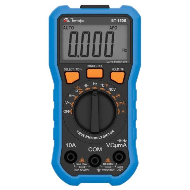 O modelo ET-1505 é um multímetro compacto, prático e de fácil manuseio. Ele faz medições de corrente AC/ DC, tensões AC/DC, resistência, capacitância, temperatura, teste de diodo e continuidade. Além das funções de desligamento automático, data HOLD e NCV. SEGURANÇA Como determinado pela norma de segurança NR-10, utilize sempre equipamentos de proteção individual. Sempre leia as informações de segurança e regras para operação segura contidas no manual de instruções. GERAL A precisão é dada como ±(% da leitura + número de dígitos menos significativos) para 18~28°C se não especificado de outra forma e umidade relativa entre 0~75%. Especificação válida de 10% a 100% da faixa de medida. Ciclo de calibração recomendado de 1 ano. CARACTERÍSTICAS: ● Display: 3 5/6 Dígitos, 6000 Contagens; ● Indicação de Polaridade: Automática; ● Mudança de Faixa: Automática/Manual; ● Indicação de Sobrefaixa: Indica “OL” no display; ● Taxa de Amostragem: Aprox. 3 vezes por segundo; ● Indicação de bateria fraca: “ ” é mostrado; ● Luz de Fundo e Lanterna; ● Data Hold; ● Medição de Temperatura; ● Função NCV; ● Desligamento Automático (APO 15 minutos ou off); ● Ambiente de Operação: 0 a 40°C, U.R.