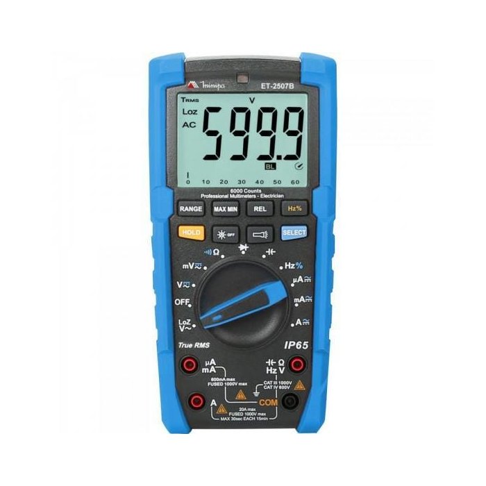 O Multímetro digital portátil CAT IV ET-2507B da Minipa oferece maior agilidade, alta precisão,. Com sofisticação e leveza, possui grande precisão e agilidade nas leituras efetuadas. O ET-2507B possui funções diversas e ideal para ambientes indústrias por possuir. Categoria de Segurança IV 600V, altamente resistente com grau de proteção IP 65 e teste de quedas de até 2 metros. Descrição Técnica: Display:3 5/6 Dígitos/6000 Tensão DC:600m/6/60/600/1000V Tensão AC:600m/6/60/600/750V Corrente DC:600µ/6000µ/60m/600m/6/20A Corrente AC:600µ/6000µ/60m/600m/6/20A Resistência:600/6k/60k/600k/6M/60MO Capacitância:6n/60n/600/6m/60mF Frequência:60~10MHz/ 0,1%~99.9% Mudança de Faixa:Automática/Manual Precisão Básica:0,5% Categoria:CAT IV 600V Dimensões:195mm x95mm x58mm Pesquisa:multimetro digital et2507b minipa - Peso: 473; - Alimentação: 1x9V 6F22.Itens Inclusos:Dados do produto Garantia: 1080(dias) Marca: MINIPA NCM: 90303100 EAN: 7898112602655 Dados de Embalagem Peso Total (Produto + Embalagem): 1028.00(gr) Altura: 19.50(cm) Largura: 9.50(cm) Profundidade: 5.80(cm)
