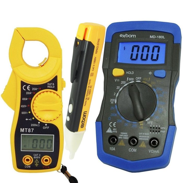 Multímetro Digital MD-180L + Alicate Amperímetro MT87 + Caneta Teste Tensão Energia Fase FEPRO-