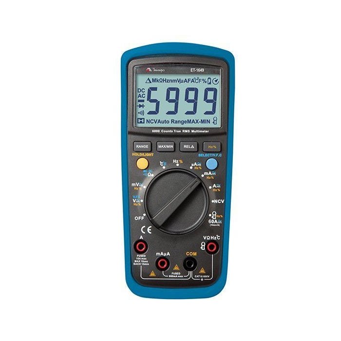 O Multímetro Digital ET-1649 diferencia-se por ser pequeno, portátil, True RMS, auto range e por possuir display de 3 5/6 dígitos com uma estrutura original, altamente confiável e segura, assim como um display grande. O instrumento pode ser usado em medidas de tensão AC/DC, corrente AC/DC, tensão com frequência variável (VFC), resistência, diodo, continuidade, capacitância, temperatura, frequência e NCV (Tensão AC sem contato). É o instrumento portátil ideal para manutenção. Este instrumento está de acordo com os padrões IEC1010: grau de poluição 2, categoria de sobretensão CAT III 600V e dupla isolação. Como determinado pela norma de segurança NR-10, utilize sempre instrumentos de proteção individual. A precisão é especificada como ±(% leitura + número de dígitos) para temperatura 23°C ±5°C e umidade relativa < 75%. A especificação é valida para 5% a 100% da faixa de medida. Ciclo de calibração recomendado de 1 ano. Especificações do Multímetro Digital ET-1649 • Display: 3 5/6 Dígitos, 6000 Contagens com 9999 para frequência de 4000 para capacitância; • Taxa de Atualização: Aproximadamente 2 ~ 3 vezes por segundo; • Indicação de Sobrefaixa: “OL.”; • Indicação de Polaridade: Automática; • Indicação de Bateria Fraca: Um desenho de uma bateria é mostrado; • Desligamento Automático: Aprox. 15 minutos; • True RMS AC; • Mudança de Faixa: Automática/Manual; • Data Hold; • Registro de MAX/MIN; • Modo Relativo (REL); • Detecção de Tensão AC sem contato (NCV); • Indicador de frequência variável (VFC); • Ambiente de Operação: 0°C ~ 40°C (32°F ~ 104°F) Armazenamento: -10°C ~ 50°C (14°F ~ 122°F); • Umidade Relativa: ≤75% @ 0°C a 30°C ≤50% @ 31°C a 40°C; • Altitude de Operação: abaixo de 2000m; • Compatibilidade eletromagnética: Em um campo de rádiofrequência (RF) de 1V/m: precisão total = precisão especificada + 5% da faixa. Não especificado para índices; de RF maioresque 1V/m; • Grau de Poluição: 2; • Alimentação: 2 x 1,5V (AA R6P); • Dimensões: 175(A ) x 80(L) x 48,5(P)mm; • Peso: Aprox. 350g (incluindo bateria); • Conformidade: CE; • Garantia: 12 meses. TENSÃO DC • Faixas: 60mV, 600mV, 6V, 60V, 1000V. • Precisão: 60mV ±(0,7%+3D). 600mV ±(0,5%+2D). 6V ~ 1000V ±(0,7%+3D). • Resolução: 0,01mV, 0,1mV, 1mV, 10mV, 100mV. • Impedância de Entrada: 10MΩ. • Máxima Tensão de Entrada: 1000V DC/750VAC RMS. CORRENTE DC • Faixas: 600µA, 6000µA, 60mA, 600mA, 6A, 10A. • Precisão: 600µA ~ 600mA ±(0,7%+2D). 6A ~ 10A ±(1% + 3D). • Resolução: 0,1µA, 1µA, 10µA, 100µA, 1mA, 10mA. • Proteção de Sobrecarga: Entrada para mA: Fusível 0,2A/600V φ6x32mm. Entrada para 10A: Fusível 10A/600V TENSÃO AC (TRUE RMS) φ6x25mm. • Faixas: 60mV, 600mV, 6V, 60V, 750V. V.F.C: 200V ~ 750V. • Precisão: 60mV ~ 600mV ±(1%+3D). 6V ~ 750V ±(0,8%+3D). V.F.C ±(4%+3D). • Resolução: 0,01mV, 0,1mV, 1mV, 10mV, 100mV. (V.F.C: 0,1/1V). • Impedância de entrada: Aprox. 10MΩ. • Máxima tensão de entrada: 750V RMS. • Frequência de resposta: 45 ~ 1kHz. V.F.C: 45 ~ 400Hz. • O fator de crista em AC pode ser de até 3,0, exceto em 750V onde pode ser até 1,5. CORRENTE AC (TRUE RMS) • Faixas: 600µA, 6000µA, 60mA, 600mA, 6A, 10A. • Precisão: 600µA ~ 600mA ±(1%+3D). 6A ~ 10A ±(1,2% + 3D). • Resolução: 0,1µA, 1µA, 10µA, 100µA, 1mA, 10mA. • Proteção de Sobrecarga: Entrada para mA Fusível 0,6A/600V φ6x32mm. Entrada para 10A Fusível 10A/250V φ6x25mm. • Frequência de resposta: 45 ~ 1kHz. • O fator de crista em AC pode ser de até 3,0. RESISTÊNCIA • Faixas: 600Ω, 6kΩ, 60kΩ, 600kΩ, 6MΩ, 60MΩ. • Precisão: 600Ω ±(1%+2D). 6kΩ ~ 600kΩ ±(0,8%+3D). 6MΩ ±(1,2%+3D). 600MΩ ±(1,5%+5D). TESTE DE DIODO • Resolução: 1mV. • Tensão de circuito aberto por volta de 3,2V. O valor de tensão de uma junção PN de silício costuma ser por volta de 0,5 ~ 0,8V. • Proteção de Sobrecarga: 600V-PTC. FREQUÊNCIA/DUTY CYCLE • Faixas: 10 Hz ~ 10MHz / 1% ~ 99,9%; • Precisão: Frequência: ±(0,1%+4D). Duty Cycle: Não especificado; • Resolução: 0,001Hz ~ 0,001MHz / 0,1%; • Amplitude de entrada: (nível DC é zero) ≤100kHz: 100mVrms ≤ a ≤ 20Vrms >100kHz ~ 1MHz: 200mVrms ≤ a ≤ 20Vrms >1MHz: 500mVrms ≤ a ≤ 20Vrms 5MHz ~ 10MHz: 900mVrms ≤ a ≤ 20Vrms; • Duty Cycle: aplicável apenas para medidas ≤ 100kHz; • Proteção de Sobrecarga: 600V-PTC; • Durante a medida de tensão ou corrente AC, caso seja necessário medir a frequência ou o duty cycle em linha viva, segue os parâmetros de entrada: Resposta em frequência: ≤ 1kHz; Tensão AC: entrada mV: ≥ 100mV; entrada V: ≥ faixa x 6%; Corrente AC: “a” é a faixa de entrada faixas 6mA, 600mA, 10A: a ≥ faixa x 6%; faixas 600μA, 60mA, 6A: a ≥ faixa x 60%. TEMPERATURA • Faixas: -40ºC ~ 1000ºC (-40ºF ~ 1832ºF); • Precisão: -40ºC ~ 0ºC ±(3%); 0ºC ~ 100ºC ±(1%+3D); 101ºC ~ 1000ºC ±(2%+3D); -40ºF ~ 32ºF ±(5%); 33ºF ~ 212ºF ±(1,5%+5D); 101ºC ~ 1000ºC ±(2,5%+3D); • Resolução: 1ºC/1ºF; • A ponta de prova de temperatura inclusa pode ser usada somente nas temperaturas menores que 230ºC/446°F; • Proteção de Sobrecarga: 600V-PTC. TESTE DE CONTINUIDADE • Faixa; • Resolução: 0,1Ω; • Acima de 150Ω, o alarme sonoro não é ativado. O alarme sonoro é ativado quando o objeto medido está com boa condutividade(resistência ≤10Ω); • Proteção de Sobrecarga: 600V-PTC; • Resolução: 0,1Ω, 1Ω, 10kΩ, 100Ω, 1kΩ, 10kΩ; • Proteção de Sobrecarga: 600V-PTC. CORRENTE AC/DC (ATRAVÉS DE GARRA) • Faixas: 60A AC/DC; • Precisão: 60A DC ±(1%+3D). 60AAC ±(1,2% + 3D); • Resolução: 10mA; • Proteção de Sobrecarga: 600V-PTC. CAPACITÂNCIA • Faixas: 10nF, 100nF, 1uF, 10uF, 100uF, 1mF, 10mF, 100mF; • Precisão: 10nF ±(4%+10D); 100nF ~ 1mF ±(4%+5D) 10mF ~ 100mF ±(10% ≤2mF) • Resolu