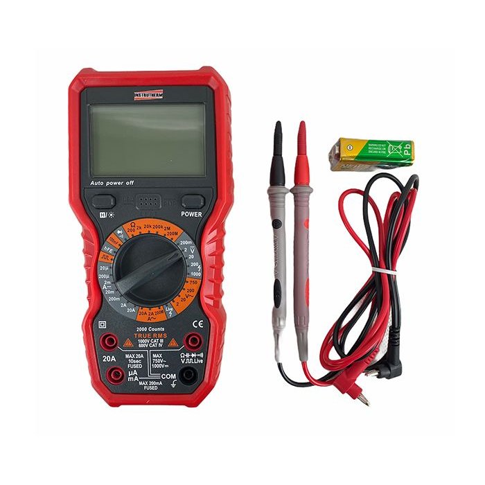 O multímetro digital portátil True Rms mod. MD-800, conta com um display LCD de 3 ½ dígitos e 2000 contagens, retroiluminado, indicação polaridade automática de sobre escala. Realiza medição de tensão AC/DC, corrente AC/DC, resistência, capacitância. É possível realizar testes em: diodo, transistor HFE, continuidade audível, linha viva. O equipamento ainda conta com a função HOLD, saída de onda quadrada. É um aparelho robusto, podendo ser utilizado para as mais diversas finalidades, desde atividade profissionais à estudantes de eletrônica e elétrica.