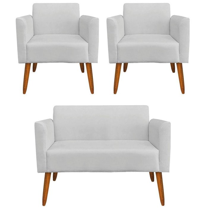 Namoradeira e 2 Poltronas Pés Palito Madeira Suede Cinza
