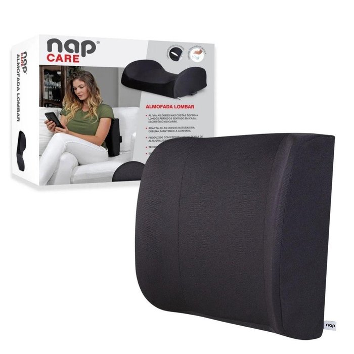Nap Almofada Nasa Encosto Apoio Lombar P/ Cadeira e Escritório Preto ACV0068Almofada Nasa Suporte Lombar para CadeiraAlivia as dores nas costas devido a longos períodos sentado em casa, escritório ou carro.Adapta-se as curvas naturais da coluna, mantendo-a alinhada.Produzido com espuma visco elástica de alta qualidade.Tecido leve e respirável.Suporte elástico.Dimensões:35 x 30 x 10 cmPeso aproximado: 370gComposição:- Enchimento: Espuma de poliuretano viscoelástica com tratamento antimicrobial Ultra-fresh.- Revestimento: capa removível e lavável em malha dry 100% poliéster.Conteúdo na embalagem:- 1 Almofada Lombar Grande