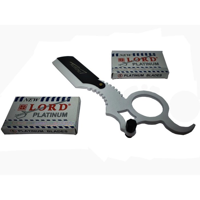 1) navalhete de dedo profissional , branca com clip preto, com trava, marca mompil, modelo mn-031, produzida com aço inoxidável de excelente qualidade, pesando cerca de 43 gramas, medindo 12 centimetros de cumprimento, 02 centimetros de largura e 2 milimetros de espessura. Usa-se com meia lamina de barbear descartável (lamina de barbear descartável partida, do tipo gillette). Importado do pakistão. Distribuido e comercializado por mompil importação e exportação.