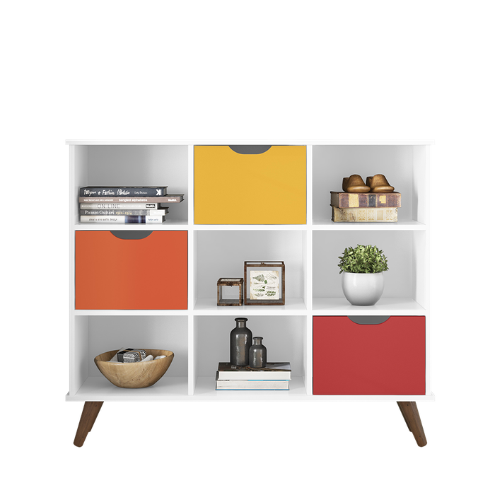 Características do nicho organizador: Acabamento revestido em pintura UV atóxica e livre de materiais pesados na cor branca Produzido em MDP de 15 mm Disposição de 9 prateleiras 4 pés retrô estilo palito inclusos para evitar o contato do produto com o chão Características das gavetas: Acabamento revestido em pintura UV atóxica e livre de materiais pesados na cor vermelha, amarela e laranja Gavetas com fitas de feltro na parte inferior para não riscar o produto Melhora a divisão interna do nicho organizador Frente das gavetas com acabamento de bordas em pintura PU Dimensões: NICHO ORGANIZADOR Largura: 108 cm Altura: 92,5 cm Profundidade: 33,5 cm GAVETAS Largura: 32,8 cm Altura: 23,2 cm Profundidade: 30,8 cm Peso suportado: NICHO ORGANIZADOR 3 kg distribuídos e sem impacto (prateleiras) 30 kg distribuídos e sem impacto (total) GAVETAS 5 kg distribuídos e sem impacto Itens inclusos: 01 Nicho Organizador 01 Kit de Pés 03 Gavetas Coloridas Manual de montagem Acessórios para montagem Informações de transporte: Quantidade de volumes: 4 volumes (2 volumes do nicho, 1 volume dos pés e 1 volume das gavetas) Informações importantes: - O produto vai desmontado. - A loja não se responsabiliza pela montagem. - A montagem é de total responsabilidade do comprador. Recomendamos que seja feita por um profissional. - Objetos de cena e decoração não acompanham o produto. - As imagens são meramente ilustrativas. - As cores dos objetos podem sofrer alterações devido à luminosidade, tonalidade da cor do produto, as configurações do seu monitor/tela e da sua percepção visual. - Eventuais despesas adicionais são responsabilidade do cliente. - Não nos responsabilizamos pela montagem ou desmontagem dos produtos, bem como transporte por escada, elevadores e/ou portas e janelas, ou içamento das mercadorias.Para maiores informações, entre em contato através de nossa central de atendimento.
